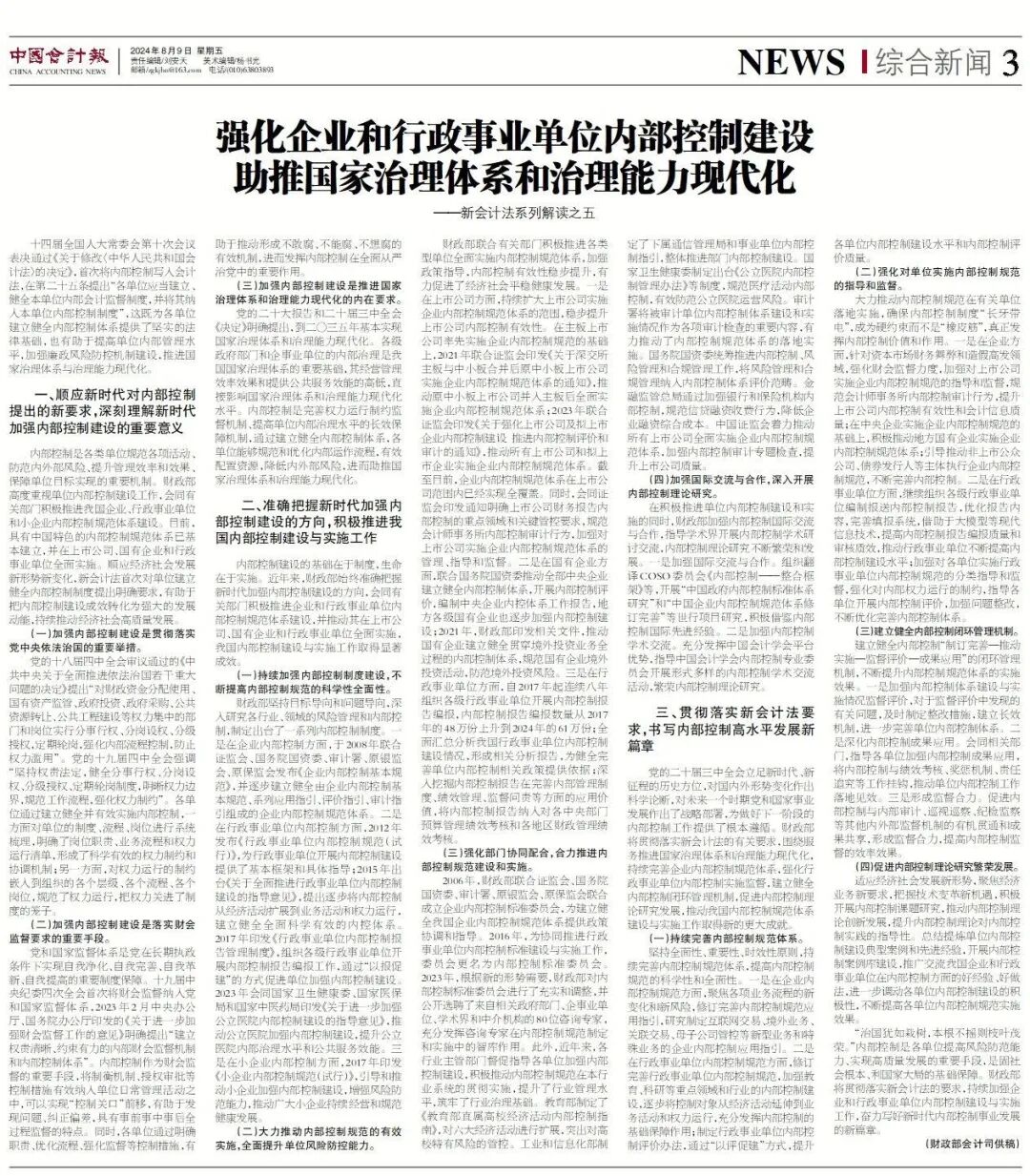 新会计法系列解读(五):强化企业和行政事业单位内部控制建设 助推国家治理体系和治理能力现代化