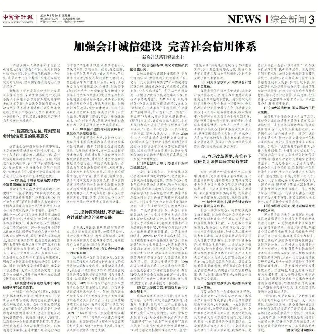 (一)加强会计诚信建设是贯彻党中央决策部署的重要举措。习近平总书记高度重视诚信建设,在党的二十大报告中指出“弘扬诚信文化,健全诚信建设长效机制”,并曾对注册会计师行业作出要“紧紧抓住服务国家建设这个主题和诚信建设这条主线”的重要批示,为会计诚信建设提供了根本遵循。党的二十届三中全会《决定》在完善市场经济基础制度主要任务中,明确提出“健全社会信用体系和监管制度”。中共中央办公厅、国务院办公厅印发的《关于进一步加强财会监督工作的意见》,强调诚信建设在健全财会监督体系方面的作用,要求“加强行业诚信建设,健全行业诚信档案,把诚信建设要求贯穿行业管理和服务工作各环节”“强化行业日常监管和信用管理,坚决清除害群之马”。新会计法的出台,进一步夯实了会计行业推动社会信用体系建设的制度基础,明确了会计信用监管和诚信建设的主要方向。因此,持续加强会计诚信建设,健全会计信用体系,是深入贯彻落实党的二十届三中全会精神,推动有效市场和有为政府良性互动的重要举措。(二)加强会计诚信建设是维护市场经济秩序的必然要求。二十届三中全会《决定》指出,必须更好发挥市场机制作用,创造更加公平、更有活力的市场环境,实现资源配置效率最优化和效益最大化。会计信息是经济发展的“晴雨表”,高质量会计信息是引导资源有效配置的基本保障,也是宏观经济决策的重要依据。投资者、债权人、经营者,以及社会公众和政府都需要真实、可靠的会计信息为其合理决策提供支持。作为通用商业语言,会计在整个经济运行和经济管理中的基础性作用,必然要求会计人员诚实守信、客观公正。然而,财务造假、会计信息失真等问题一直时有发生,不仅损害投资者、债权人等利益相关者利益,有些甚至带来严重经济后果。6月,国务院办公厅转发证监会、公安部、财政部等5部门《关于进一步做好资本市场财务造假综合惩防工作的意见》提出要坚决打击和遏制重点领域财务造假,并要求加强联合惩戒与社会监督,强化失信约束。加强会计诚信建设,强化自律约束,有助于从源头上防范财务造假,将失信行为记入信用记录,增强警示震慑,有助于提高违法成本,优化行业生态,是维护投资者合法利益和正常市场经济秩序的现实要求。(三)加强会计诚信建设是发挥会计职能作用的基础保障。会计的发展历史表明,会计的内涵与外延是随着社会发展和经济管理的需要不断拓展的。核算与监督是会计的传统职能,在新的发展阶段,会计正在以数字技术为支撑,形成对内提升单位管理水平和风险管控能力、对外服务财务管理和宏观经济治理的会计职能拓展新格局。会计在有效实施企业经营战略、风险管理、提高管理水平和经济效益,在服务政府预算管理、资产管理、债务管理、绩效管理,在为可持续发展提供信息支撑,在评估国家宏观经济运行和财政税收政策效果等方面将发挥越来越重要的基础作用。这就更需要会计人员诚实守信,保证会计信息的真实、可靠、完整,为我国社会主义市场经济发展建设高质量的基础数据库。近年来,财政部坚决贯彻落实党中央、国务院有关决策部署,加强顶层设计,通过完善法律法规、树立道德标准、深化教育引导和加大惩戒力度等方式,持续推动行业诚信建设,取得显著成效。法律法规体现鲜明价值导向,会计法律法规直接影响人们对会计行业核心价值的认知认同和自觉践行。在推动会计法修改、注册会计师法修订工作中,财政部重视并坚持将会计诚信要求体现到相关法律条款中,以将其转化为具有刚性约束力的法律规定。2022年11月向社会公开征求意见的社会信用体系建设法将会计作为商务诚信建设重点领域之一。同时,财政部先后制定印发了《关于加强会计人员诚信建设的指导意见》、《注册会计师行业诚信建设纲要》,在《会计改革与发展“十四五”规划纲要》和《会计行业人才发展规划(2021—2025年)》中将“加强会计诚信建设”作为“十四五”时期的一项重点任务积极推进。相关法律的建立健全和有关政策的制定发布,为建立会计信用记录、提高行业诚信水平提供了有力支撑。以核心价值构建职业道德规范,是强化道德认同、指引道德实践的重要手段。党的十九大报告明确要求“深入实施道德建设工程,推进社会公德、职业道德、家庭美德、个人品德建设”。党的二十大报告进一步提出,“实施公民道德建设工程,弘扬中华传统美德”。2023年1月,财政部印发《会计人员职业道德规范》,提出以“坚持诚信、守法奉公”“坚持准则、守责敬业”“坚持学习、守正创新”(以下简称“三坚三守”)为核心表述的职业道德要求。《规范》印发后,财政部组织各地区、各有关部门和单位开展了形式多样的宣传学习活动,“三坚三守”成为会计人员耳熟能详的词汇,逐渐入脑入心 。此外,2020年12月中国注册会计师协会修订发布《中国注册会计师职业道德守则》和《中国注册会计师协会非执业会员职业道德守则》,以顺应经济社会发展对注册会计师诚信和职业道德水平提出的更高要求,进一步提升审计质量。一是注重以德育人。把诚信要求体现在课程体系和教学内容中,使传授知识过程成为道德教化过程。2023年《会计专业学位类别简介及其博士、硕士学位基本要求》将恪守