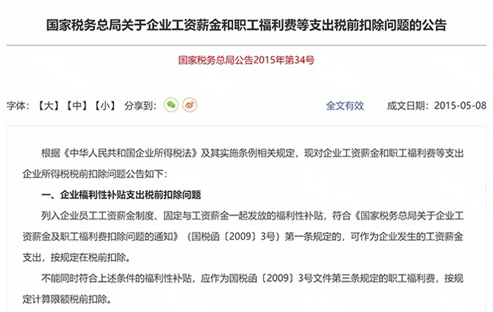 《企业工资、薪金和职工福利费等支出税前扣除问题的公告》(国家税务总局公告2015年第34号)第一条规定,列入企业员工工资薪金制度、固定与工资薪金一起发放的福利性补贴,符合《国家税务总局关于企业工资薪金和职工福利费等支出税前扣除问题的公告》(国税函〔2009〕3号)第一条的,可作为企业发生的工资薪金支出,按规定在税前扣除。不能同时符合上述条件的福利性补贴,应作为国税函〔2009〕3号文件第三条规定的职工福利费,按规定计算限额税前扣除。