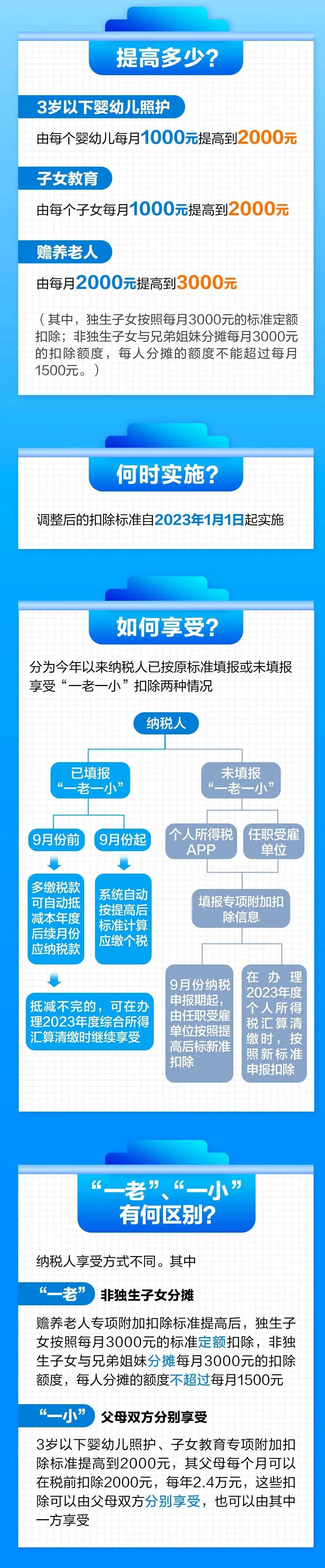 对于无需缴纳个税的人群,“一老一小”扣除标准提高与否,对他们并无影响。真正影响的是缴纳个税且有老人孩子的纳税人。