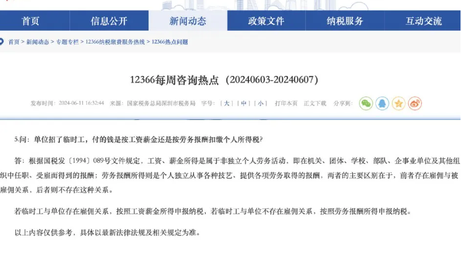 回复:若临时工与单位存在雇佣关系,按照工资薪金所得申报纳税,若临时工与单位不存在雇佣关系,按照劳务报酬所得申报纳税。